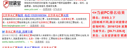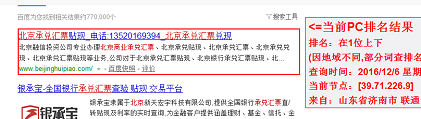 在2016年七月底,北京融信投资公司与北京云无限SEO优化部门进行合作。优化网站www.beijinghuipiao.com。优化关键词北京商业承兑汇票、北京承兑汇票以及北京银行承兑汇票。经过两个月的时间三个关键词全部达标。现如今结果如下: